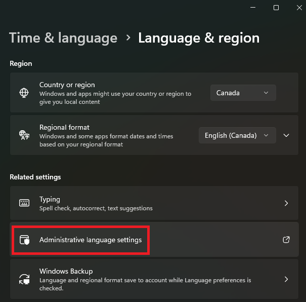 Go to “Settings > Time and Language > Language and Region” and select “Administrative language settings”: