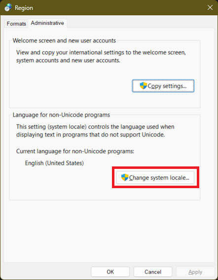 In the next dialog box select “Change system locale”: