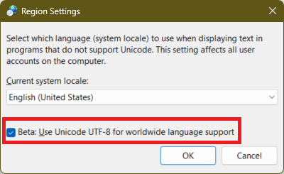 Finally, check the “Beta: Use Unicode UTF-8 for worldwide language support” checkbox: